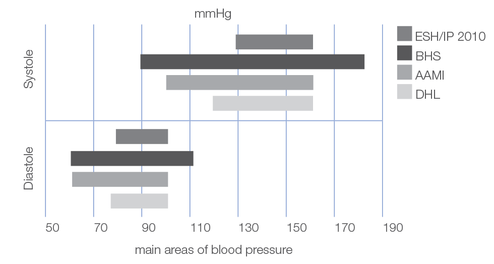 Druga je razlika u ispitivanim razlikama krvnog tlaka: rasponi krvnog tlaka u kojima se provjeravaju tlakomjeri razlikuju se ovisno o protokolu (vidi grafikon). Što je širi raspon, to se bolje provjera jesu li uređaji pouzdani pri ekstremno niskom ili iznimno visokome krvnom tlaku.